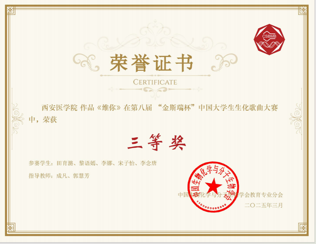 3月22日,由中国生物化学与分子生物学会教育专业分会、生命科学国家级实验教学示范中心(南京大学)、山东生物化学与分子生物学会联合主办的第八届“金斯瑞杯”中国大学生生化歌曲大赛落下帷幕,来自全国68所高校的70首作品在山东第一医科大学大学生活动中心进行了现场表演,经过激烈角逐,由我校学生创作的生化歌曲《维你》荣获三等奖。