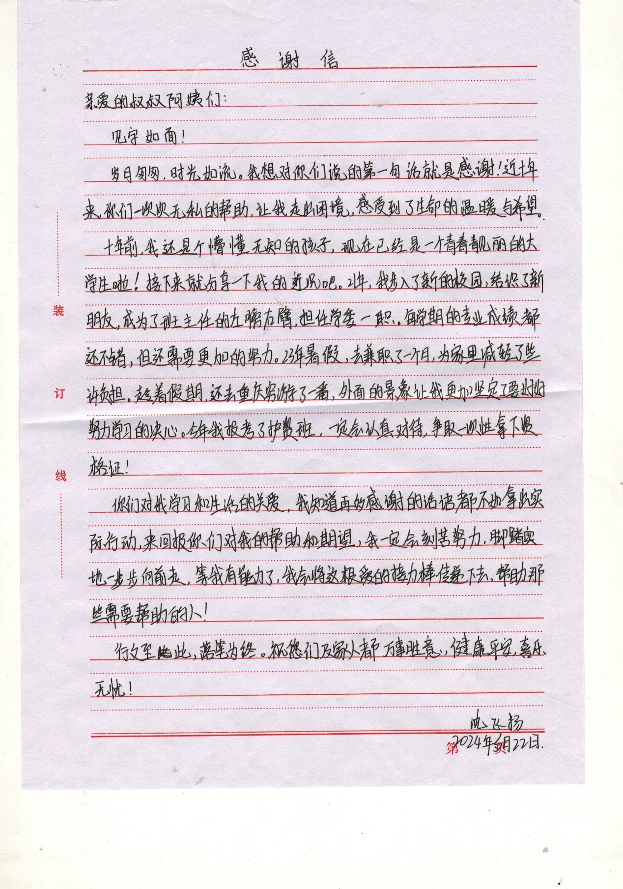 2024年3月,一封感谢信送到了基础医学部党总支第二党支部全体党员手中,寄来感谢信的是目前在阎良上学的一位学生,她在信中对持续8年资助她的所有党员表示感谢,并述说自己的近况,告诉大家她的学业和生活,她更表示,将会把得到的爱心传递下去,用自己的力量帮助更多有需要的人。