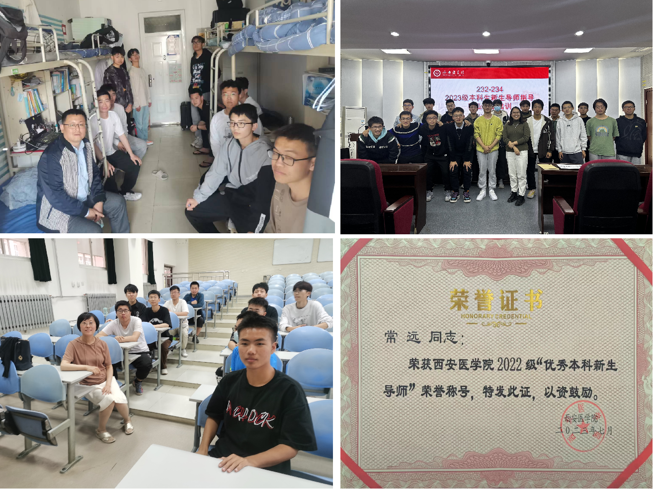 《组织学与胚胎学》是在大学一年级开设的专业基础课,学生还处在由高中到大学的过渡期。为了更好地引导学生树立正确的学习观、生活观,帮助学生进行学业规划和职业生涯规划,教研室有8名教师申请作为大一学生的“新生导师”,走访学生宿舍,了解学生的困惑,解决学生的困难。其中常远博士还被评为“优秀新生导师”。