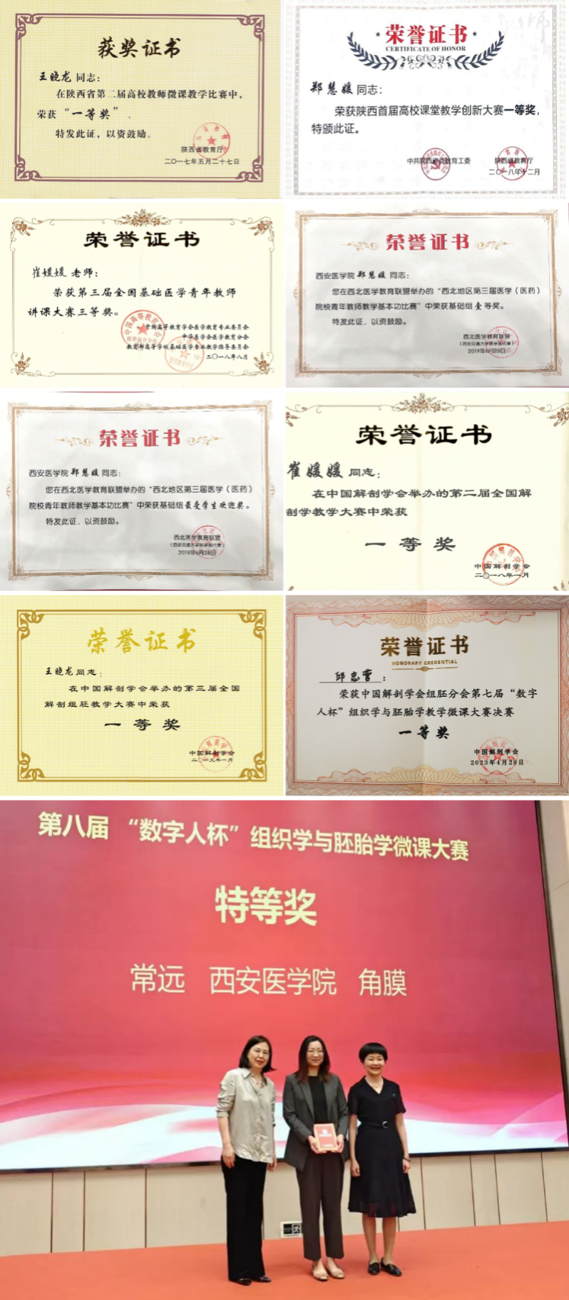教研室坚持以教学为本,十分重视教师教学能力的提高。以教学竞赛为契机,以赛促教,多人次在全校、全省及全国范围内获得教学竞赛奖,包括全国高校(医学类)微课教学比赛一等奖、陕西省高校课堂教学创新大赛一等奖、中国解剖学会微课教学比赛特等奖及一等奖、陕西高校教师微课教学比赛一等奖、陕西省高校教师思政大练兵课程思政教学能手等优异成绩。教师的教学能力获得了学校及国内同行的认可。