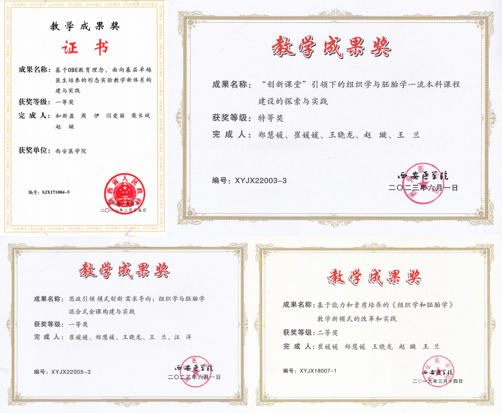 《组织学与胚胎学》作为医学专业的重要基础课,与《解剖学》并列为医学知识体系的基石。教研室紧跟教育科学发展潮流,开展一流课程建设,进行教学改革研究。2004年,《组织学与胚胎学》就被评为陕西省精品课程,2020年获批陕西省线下一流本科课程。2014年以来,教研室共主持省级教改课题4项,“十三五”及“十四五”规划教改课题3项,校级教改课题5项。获得省级教学成果一等奖1项、二等奖1项,校级教学成果特等奖1项、一等奖1项、二等奖3项。发表教学相关论文近20篇。