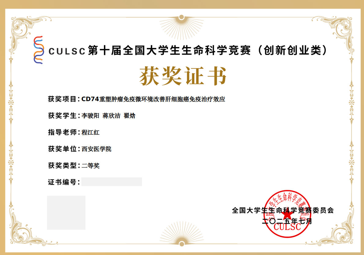 经过激烈的角逐,我校共有7支队伍在本次竞赛中获奖。其中,刘海甜、周逢霖、罗志锐、禚晓彤、吴钰、祁欢参赛的项目《见“胱”知著——多功能同型半胱氨酸检测仪》荣获一等奖;李骏阳、蒋欣洁、翟焓参赛的项目《CD74重塑肿瘤免疫微环境改善肝细胞癌免疫治疗效应》获得二等奖;我校参赛的其余5支队伍均获得三等奖,充分展示了我校学子在生命科学领域的实力和风采。