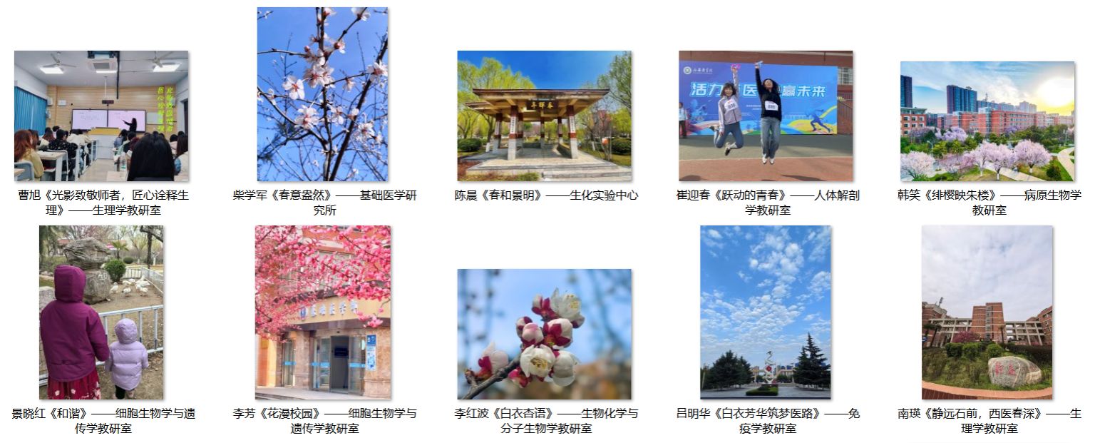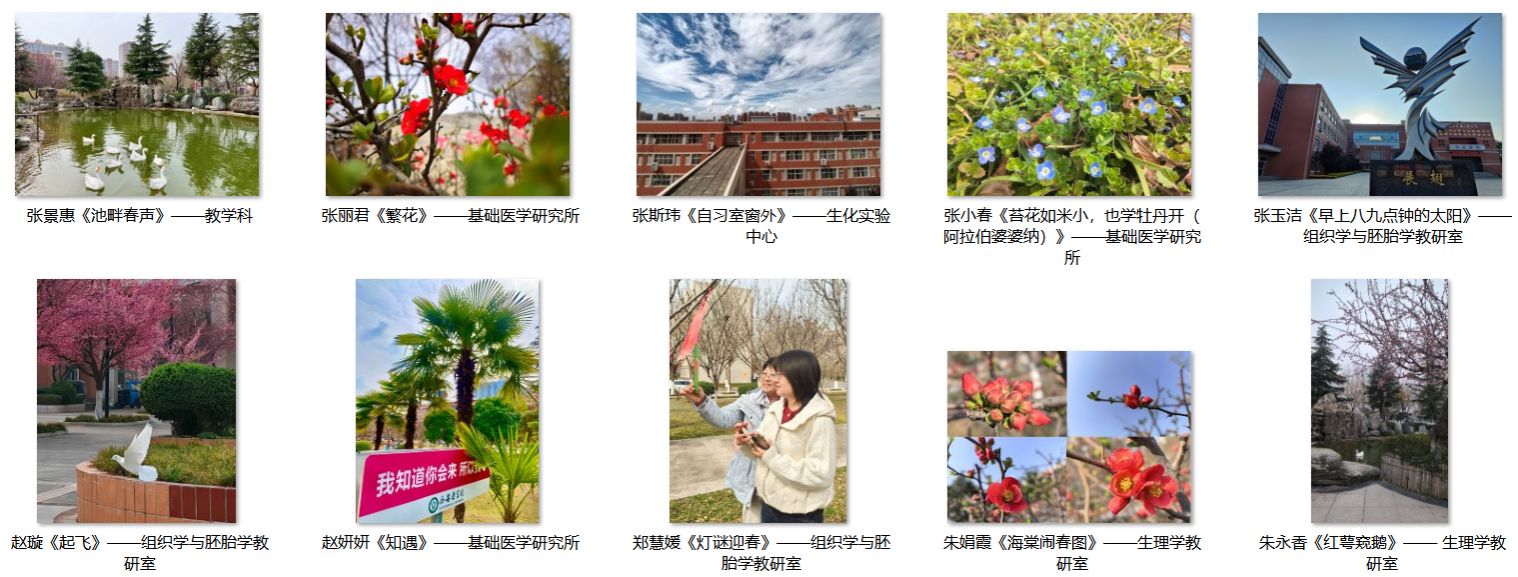 此次摄影作品征集活动,不仅为基础医学部女教职工搭建了展示自我、交流互鉴的良好平台,更凝聚了巾帼力量、激发了工作热情。活动引导全体女教职工以更饱满的精神状态、更昂扬的奋斗姿态,投身教育教学与科研工作,切实践行“奋进‘十五五’巾帼启新程”的时代号召,在各自岗位上绽放芳华、贡献力量,为基础医学部高质量发展、为学校事业进步注入巾帼智慧与巾帼力量。(基础医学部分会 文/郑慧媛 图/部分摄影作品 审核/尚瑜)